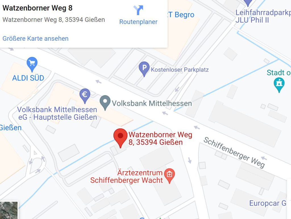 Die Impfambulanz befindet sich in einer früheren Arztpraxis hinter dem Gebäude der Volksbank Mittelhessen im Watzenborner Weg 8. Parkplätze stehen auf einem separaten Parkplatz vor dem Gebäude und im Parkhaus der Volksbank zur Verfügung.