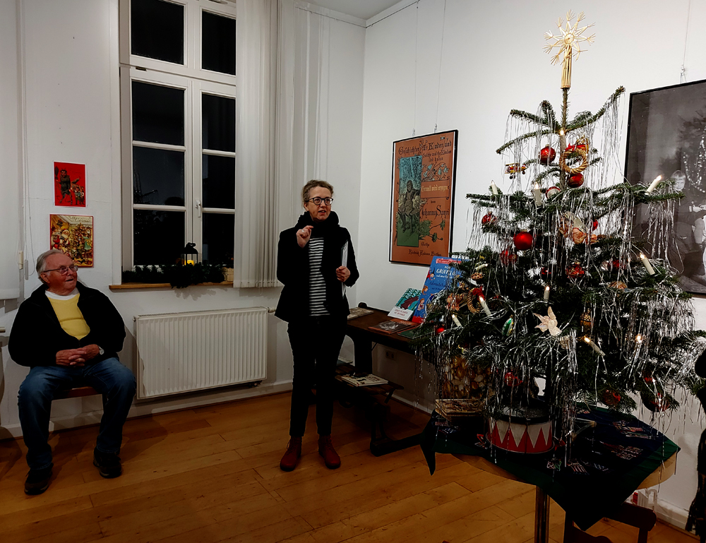 Ist denn schon wieder Weihnachten? Jedenfalls sei es recht schwierig, Mitte November einen echten Weihnachtsbaum zu bekommen, erzählte Jutta Failing am Samstag den 18. November den wenigen Besucher/innen, die um 19.00 trotz Dunkelheit, Kälte und Starkregen den Weg ins Heimatmuseum gefunden hatten. Die Sonderausstellung, „Famose und kuriose Kinder- und Jugendbücher“ geht in die weihnachtliche Verlängerung. Sie ist an jedem Sonntag geöffnet, außerdem zum letzten Mal am zweiten Weihnachtsfeiertag, jeweils von 15 – 17.00 Uhr.