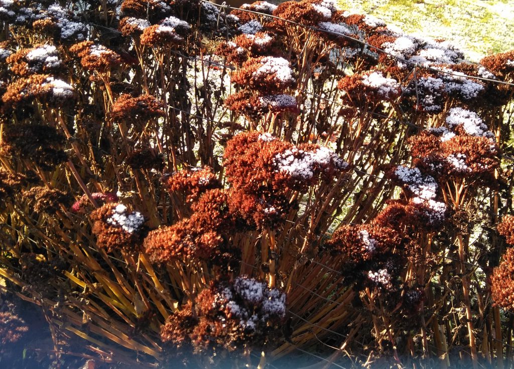 Nicht zu unterschätzen sind die trockenen Stängel der verschiedenen Stauden. Manche sind wirklich nach dem ersten Dauerregen oder Frost recht hässlich. Die schneide ich schon zurück. Sie kommen dann ungeschreddert auf einen weniger sichtbaren Platz im Garten. So bleiben die Insekten am Leben, die sich in und auf den Stängeln angesiedelt haben. Manche Schmetterlingspuppe könnte darunter sein, auf jeden Fall viel Nahrung für die Vögel. Die meisten Staudenstängel lasse ich jedoch bis zum Februar oder März stehen. Sie werden von Meisen als Warteplatz genutzt für Futter auf dem Boden. Manche Vögel warten dort, bis der Vorgänger weg geflogen ist. Und mit einer Schneehaube können sie auch im Winter dekorativ aussehen.