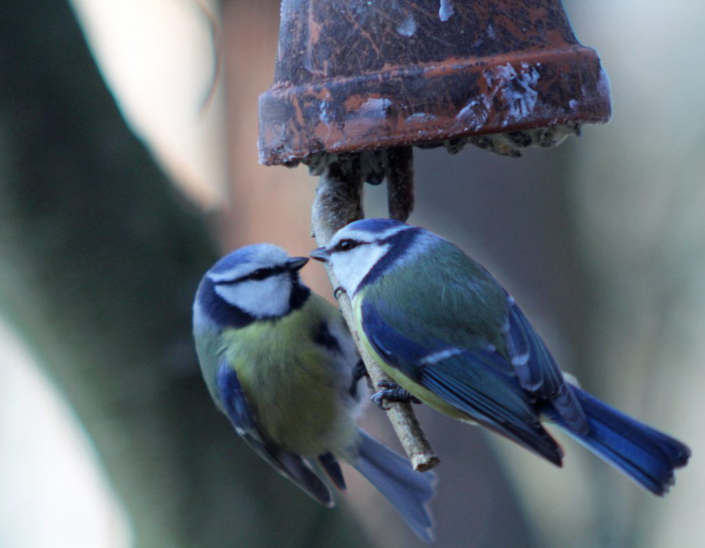 Vögel sind auch nur Menschen. Wir wünschen uns den Supermarkt gegenüber oder die Stammkneipe um die Ecke. Vögel möchten die Futterstelle in der Nähe ihres Schlafplatzes. Während ich dies schreibe, zieht Tief Rudi über Biebertal. Wer jetzt fliegt, verliert viel Energie. Kaum ist der Sturm vorbei, sind die hungrigen Tiere wieder da. In der von manchen Leuten geächteten Korkenzieherhasel hocken die Kleinen sommers wie winters. Dieser verschnörkelte Strauch bietet Schutz gegen Fressfeinde wie z.B. die Bussarde und gegen Wind. Andererseits muss es auf den Zweigen jede Menge für uns mit bloßem Auge nicht sichtbare Insekten geben, denn die Vögel picken dauernd dran herum. Unser Futter-Angebot entspricht eher dem Restaurantbesuch. Wir haben viele Bäume und Sträucher im Garten, auch verschiedene Nadelbäume – ebenfalls von manchen Naturschützern geächtet. In ihnen leben aber ebenfalls etliche Vogelarten, vor allem die „Grauen“, die wir immer noch nicht alle bestimmt haben. Man sieht sie nur im Fluge. Und die Vögel nach den Stimmen zu erkennen? Da müssen wir leider passen.
