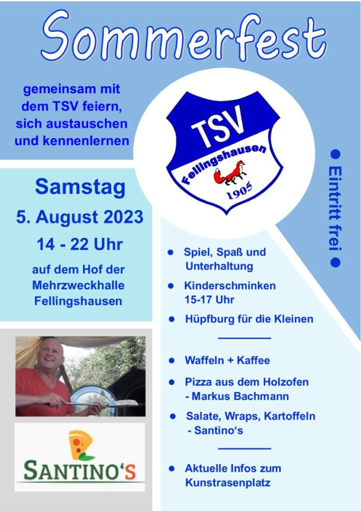 Mit diesem Plakat hatte der TSV Fellingshausen für sein diesjähriges Sommerfest geworben, … und viele Fellingshäuser/innen, natürlich auch die Bürgermeisterin Patricia Ortmann, der Ortsvorsteher Dr. Alfons Lindemann und die Presse mit Volker Mattern, kamen.