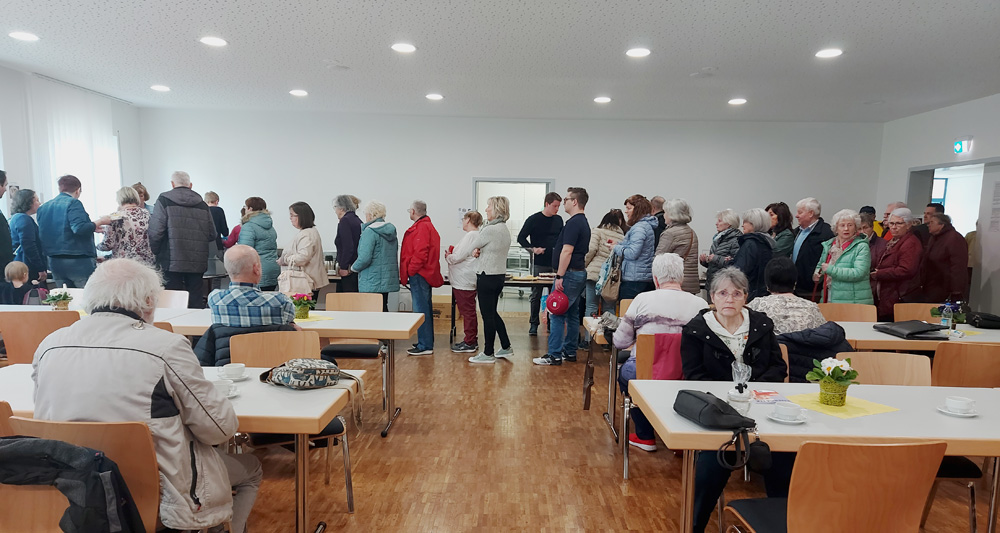 Im kleinen Raum des Bürgerhauses Rodheim sieht es kurz vor 12.00 Uhr aus als sei ein Kreuzfahrtschiff – oder wenigstens ein Bus – eingetroffen. Nicht nur Kaffee und Kuchen, sondern auch die beliebte Grüne Soße zieht die Leute an.