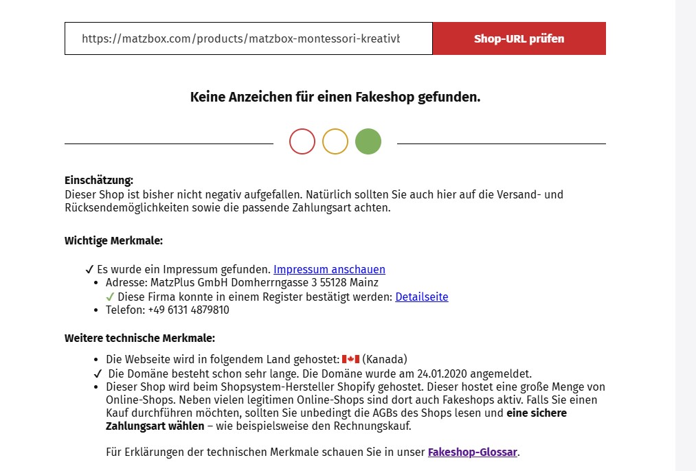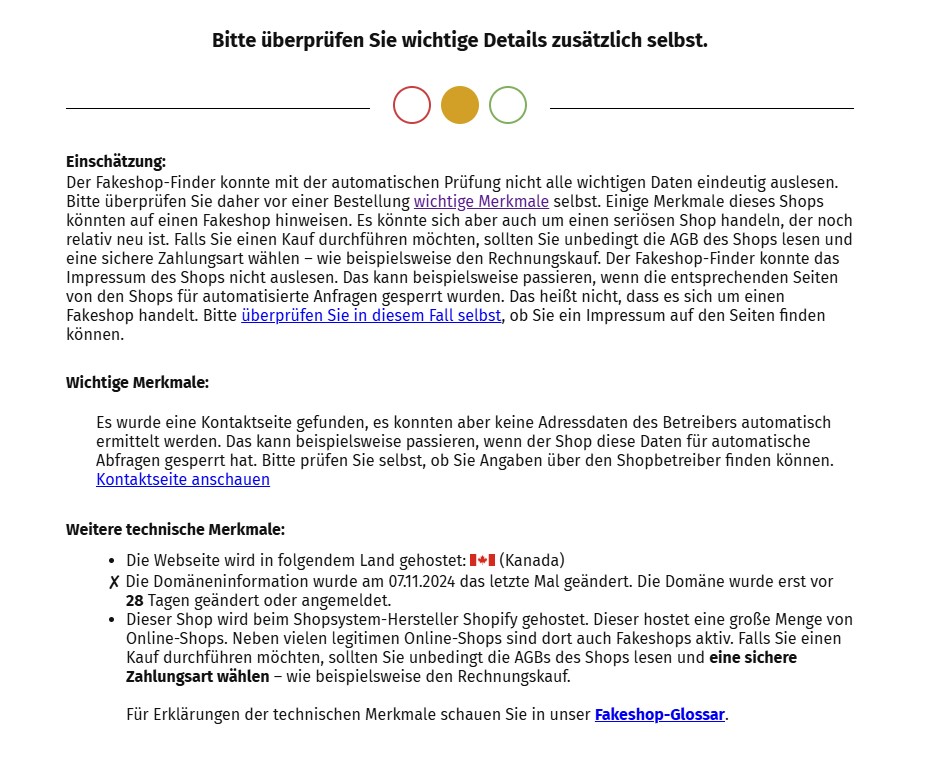 Hier kann man die URL eingeben und wird gegebenenfalls vor eventuellen Fakeshops rechtzeitig gewarnt. Dort bekommt ihr schnell und einfach eine Übersicht, ob dieser Shop vertrauenswürdig ist. Viele Shops sind meist gar nicht in Deutschland, sondern wie in meinem Beispielbildern in Kanada gehostet.