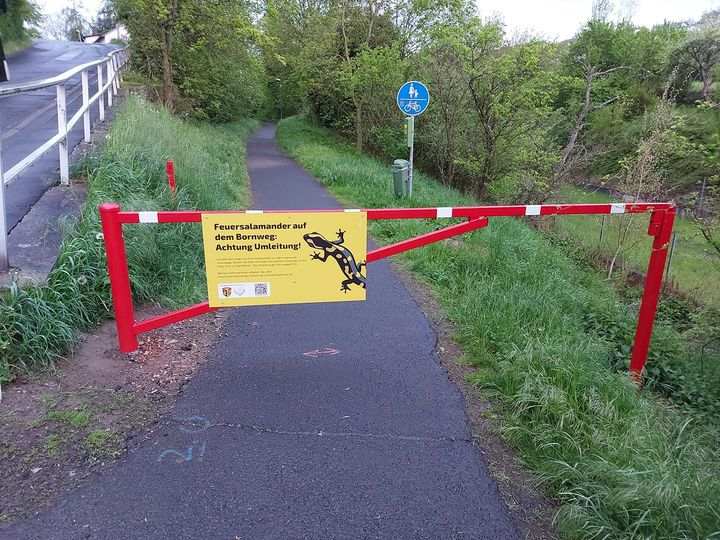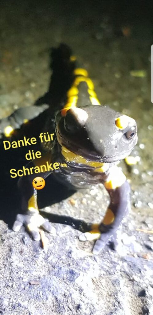 „Gestern Abend, als ich die Schranken unten am Bornweg zum Schutz der dort lebenden Feuersalamanderpopulation schloss, beschwerte sich ein Herr mit Hund über die Handhabung der installierten Schranken bei Regen, da er dort noch nie einen Feuersalamander gesehen habe.“