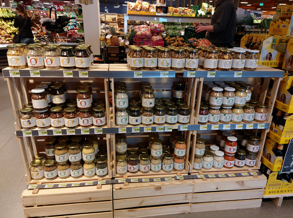 Diesem Regal steht man gegenüber, sobald man den Edeka-Markt in Rodheim betreten hat. Herr Falk versucht hier, das Prinzip des Unverpackt-Ladens durch Mehrweggläser an Kundinnen und Kunden zu bringen. Damit wird Plastik vermieden, vor allem aber die Tüten aus Verbundwerkstoffen, in die viele Firmen die oben genannten Produkte verpacken. Nach meiner Beobachtung haben die Verbundverpackungen in diesem Sektor in den letzten Jahren eher zu- als abgenommen. Umso begrüßenswerter ist die Initiative von Herrn Falk. Da er in seinen Entscheidungen unabhängig von Edeka ist, kann man auch mit Bitten und Vorschlägen zu anderen Produkten an ihn herantreten.