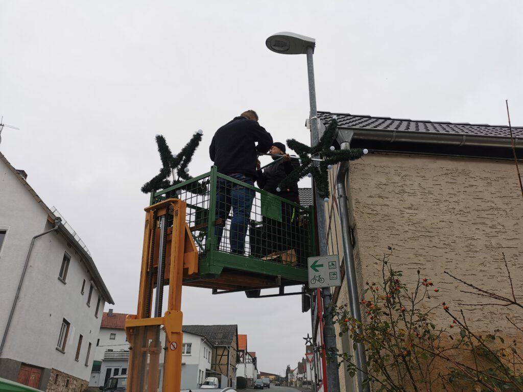 In der letzten Ortsbeiratssitzung war der Ortsbeirat Frankenbach so begeistert von der Idee der neuen Sterne und entschloss sich, nach Rücksprache mit Bürgermeisterin Patricia Ortmann, von seinem Budget weitere sieben Sterne anzuschaffen. Diese wurden durch den Ortsbeirat und die Vereinsgemeinschaft mit Unterstützung und schwerem Gerät von Matthias Ruppert am vergangenen Mittwoch schon installiert. So erscheint nicht nur die Kirchstraße in Frankenbach, sondern auch die Frankenbacher Straße und die Erdaer Straße im Glanze der neuen Weihnachtsbeleuchtung.