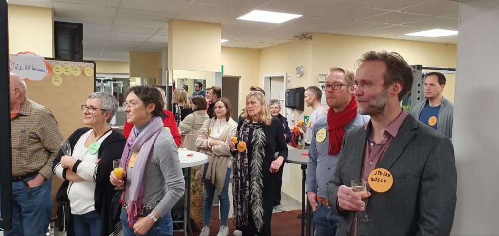 Erste Gäste werden begrüßt, stehen zusammen, kühle Getränke von Daniel´s Getränkeservice und Schnittchen von EDEKA Falk stehen bereit, ebenso wie die mit orangenen Namensschildern ausgerüsteten Trainer des BSV.