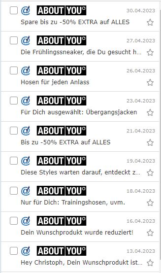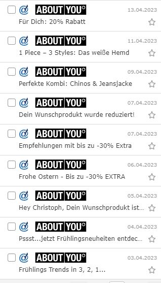 Für mich sind Newsletter aber mittlerweile eher Spamletter. Ich habe mir von About You mal den ganzen April alle Newsletter behalten. Sage und schreibe 18 Emails haben dir mir geschickt. So viel Neues kann es doch in der kurzen Zeit eigentlich gar nicht geben.