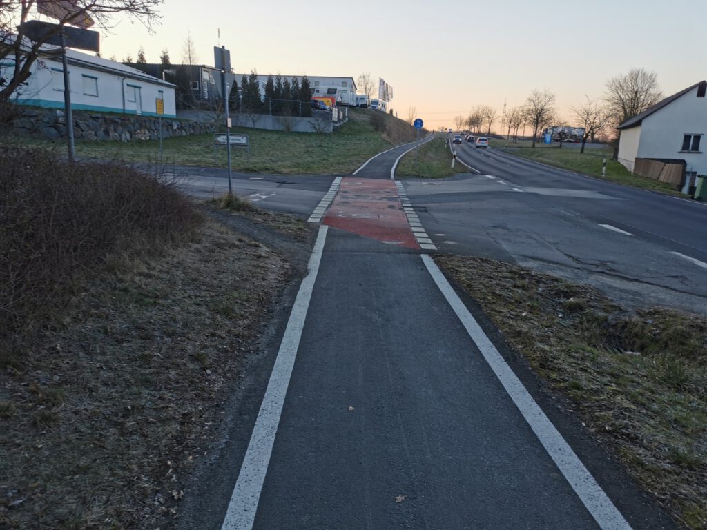Das „Vorfahrt achten„-Schild besagt ganz klar, dass ihr im Gegensatz zur Einmündung ins Gewerbegebiet (siehe Bild rechts) beim REWE keine Vorfahrt habt.
