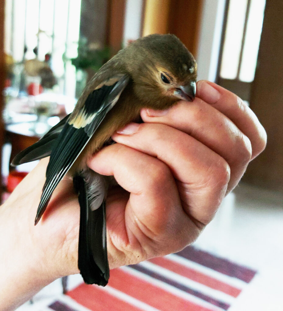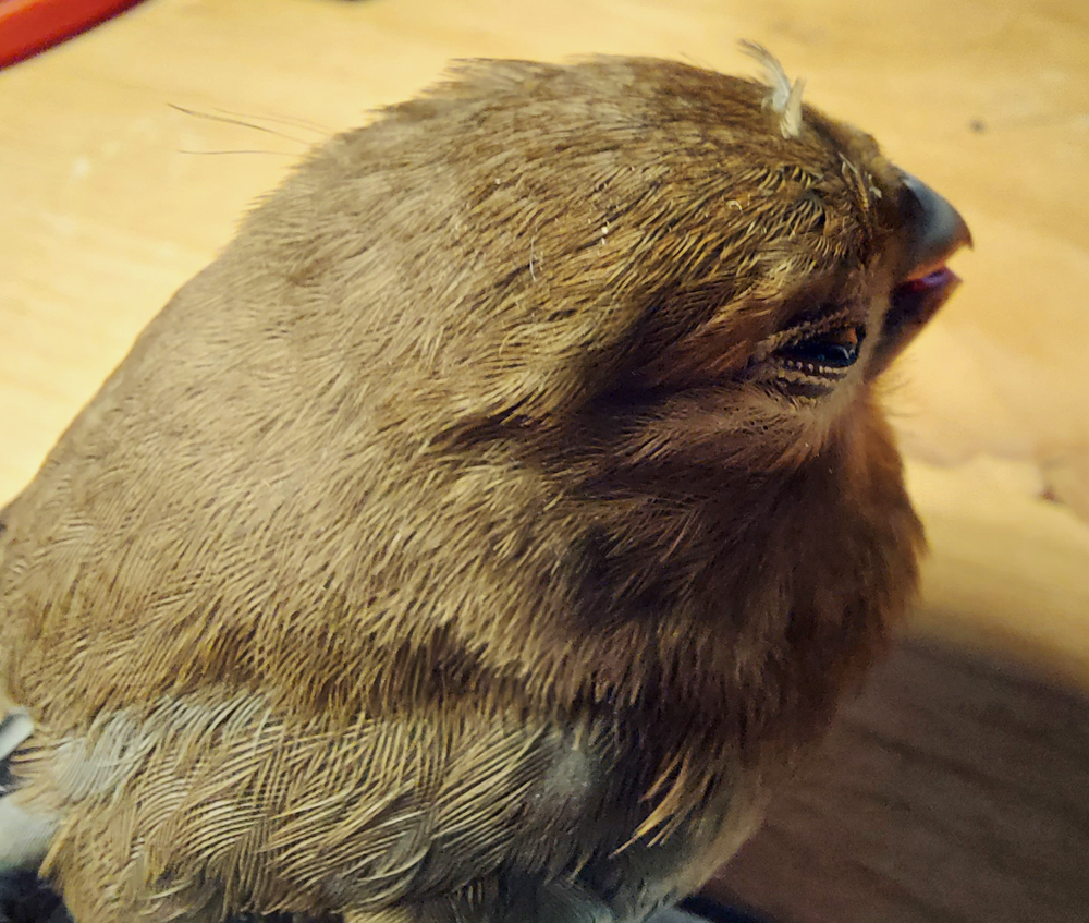 Dieser junge Dompfaff = Pyrrhula pyrrhula flog mit voller Wucht gegen eine Fensterscheibe. Er lag da wie tot, und wir glaubten nicht, dass er es schafft, denn der ganze Schnabel war voller Blut. Aber sein Herz schlug noch ganz schwach. Ich behielt ihn über eine halbe Stunde in der Hand, spielte ihm die Töne seiner Artgenossen vor und hob ihn gelegentlich in die Wärme der Schreibtischlampe. Dabei wurde er immer kurz munter. Nach einigen Wiederholungen schlug das Herz kräftiger. ich setzte ihn auf den Schreibtisch, und er machte die ersten Flugversuche.