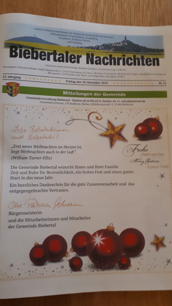 Quelle: Biebertaler Nachrichten, 20.12.2019, S. 2