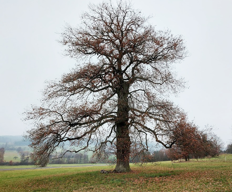 Die beiden Fotos zeigen die Toteneiche zwischen Fellingshausen und Rodheim im Abstand von 13 Tagen. Die Toteneiche ist eine der wenigen Stieleichen in unserer Umgebung. sonst überwiegen die Traubeneichen. Aber phänologische Veränderungen werden an der jahreszeitlichen Entwicklung der Stieleiche gemessen. Der phänologische Winter beginnt, sobald die Stieleiche ihre Blätter verliert. Im Foto vom