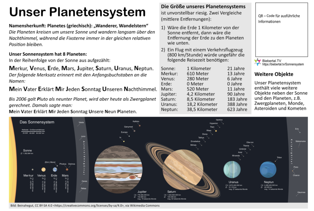 In der offiziellen Ankündigung zur Eröffnung des Planetenweges am 26. 7. 2024, 19 Uhr, im Bürgerhaus in Bieber hieß es: „Der Weg ist auf dem Verbindungsweg von der Steinmühle an der Mailhardt vorbei nach Fellingshausen angelegt. Er bietet zahlreiche Informationen in Wort und Bild, die auch über einzelne QR-Codes abrufbar sein werden. Auf einer Internetseite wird es weiterführende Informationen zu den Planeten und Stationen geben, die nicht mehr auf die Tafeln passten. Sie sind ebenfalls über den QR-Code abrufbar.“ Direkt kommt man über den Link https://biebertal.tv/planetenweg/ ebenfalls auf die Startseite. Scrollt man dort nach unter und klickt die verschiedenen Buttons an, so erhält man einerseits sehr fundierte, detaillierte Daten zu den Themen sowie spannende Links mit weiteren Informationen u.a. der NASA, der ESA und anderen Quallen.