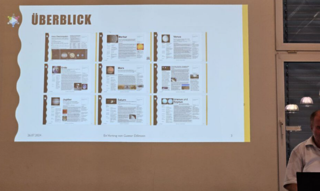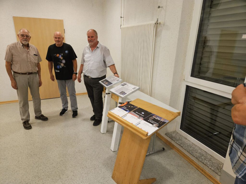 Dr. Gunnar Dillmann, selbst von der Astrologie begeistert, seit er als Kind im 1. Schuljahr die ersten Flüge von Apollo 9 und 10 erlebte, später die Mondlandung von Apollo 11 mitten in der Nacht am Fernseher miterleben durfte, stellte seine auf den Internetseiten festgehaltenen Recherchen vor, die nun über die Stelen am Weg allen zugänglich sind. Neben dem Referenten begeisterte ein 9jähriger Junge mit seinem ausgeprägten Wissen zu den Sternen und seinen reichlichen Fragen zu den einzelnen Themenfeldern. Auch er träumt davon einmal Raumfahrer zu werden.