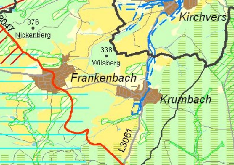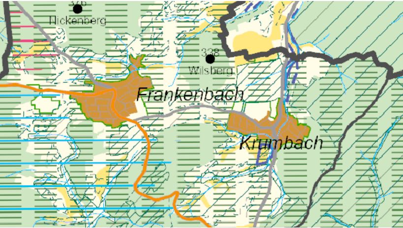 Nach genauerer Betrachtung, kann ich gegenüber dem Plan von 2010 bei Frankenbach und Krumbach keine Veränderungen erkennen. Das Gebiet (weiße Fläche rechts neben Sportplatz) oberhalb der Straße von Krumbach Richtung Frankenbach bleibt Vorranggebiet für vorbeugenden Hochwasserschutz; und auch zu der bestehenden Fernwasserleitung (dicke durchgezogene Blaue Linie Richtung Kirchvers) ist eine weitere Fernwasserleitung (gestrichelte blaue Linie) geplant. Diese beiden Punkte waren allerdings auch schon in der 2010er Karte eingezeichnet.