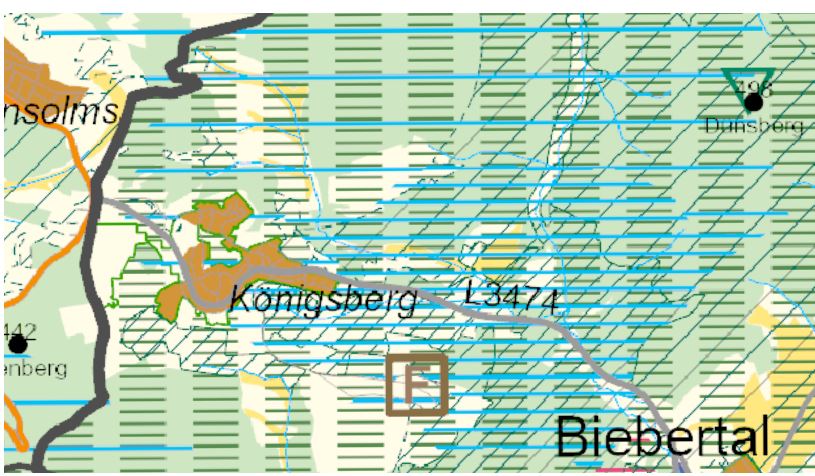 Wie bereits in Frankenbach und Krumbach ändert sich nichts. Im Osten Richtung Dünsberg dient das Gebiet vorrangig dem Grundwasserschutz. Auch sind die Flächen um den Ort als Landwirtschaftsflächen ausgewiesen. Gegenüber 2010 wird in diesem Plan das Ferienhausgebiet (braunes Quadrat mit dem F) als Bestand deutlich gekennzeichnet.