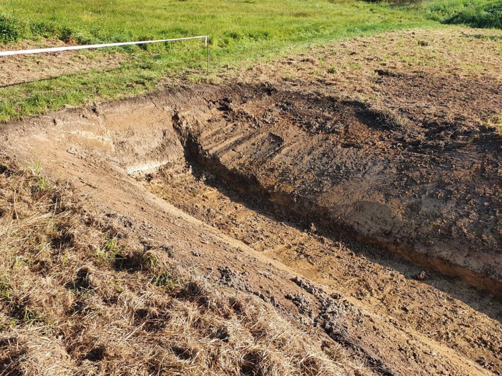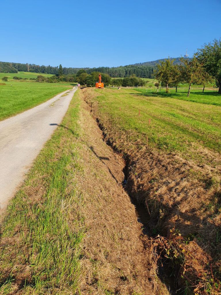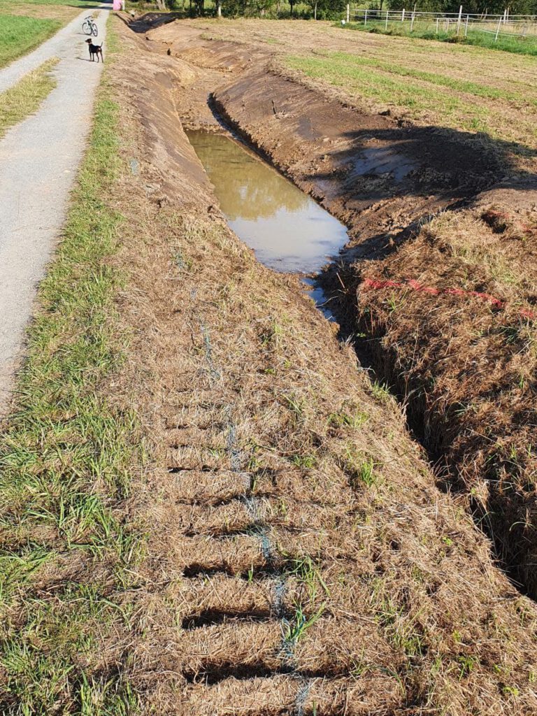 Am Weg vom Festplatz Fellingshausen Richtung Dünsberg haben Renaturierungsmaßnahmen begonnen. Im Bild links ist der Wassergraben neben dem Weg tief ausgespült und hat gerade Wände. Bei Hochwasser würde er schnell überfluten. Ja, zu manchen Zeiten fließt durch diesen Graben Wasser, das in den Bieberbach abgeführt wird. Allerdings liegt der Wasserlauf in den letzten Jahren auch oft trocken. Aber die Überflutungen an Ahr und Erft haben gezeigt, wie schnell sich das ändern kann. Im Vorfeld der Baumaßnahme Dreispitz wird ein Regen-Rückhaltebecken gebaut und ein neuer Bachlauf geformt. Durch diese Form (siehe Bild 4 – man nennt sie auch Mäander*) wird erreicht, dass bei Sturzregen das Wasser viel langsamer fließt und in die angrenzende Wiese sickert.