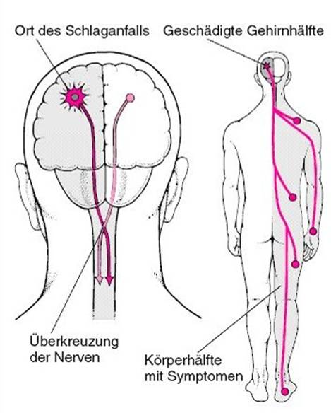 Passiert die Störung im Großhirn, dem Walnuss-ähnlichen Teil des Gehirns, das neben Handlungen und Gefühlen auch Bewegungen steuert und sorgt dafür, dass äußere Sinneseindrücke verarbeitet werden, finden sich die Folgen von Hirnnevenstörungen (z.B. Sprache, Gesichtsnerv) auf der gleiche Seite, die motorischen und sensorischen Körpersymptome jedoch auf der gegenüberliegenden Seite, da die Nervenbahnen im Nacken kreuzen.
