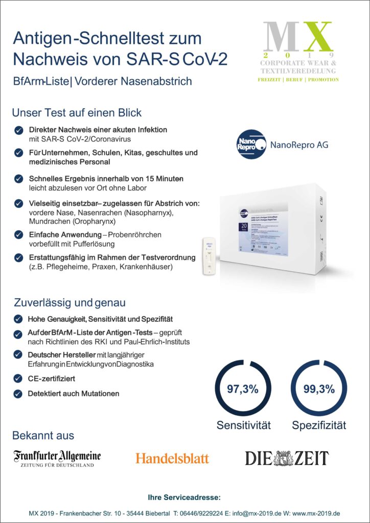 unsere Firma sitzt in Frankenbach (ehemalige Metzgerei, Bushaltestelle Mitte) und wir haben derzeit Corona Schnelltest im 20er Pack speziell für Firmen, Schulen und Kitas ab Lager lieferbar. Es handelt sich hierbei um einen deutschen Hersteller aus Marburg. Der Test detektiert auch Mutationen.