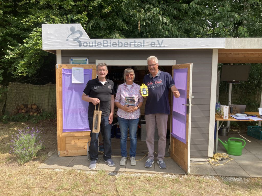 Das als Sommerturnier geplante “Boule für Alle” am 2.7 entzog sich der mäßigen Wettervorhersage in phänomenaler Weise. Mit zunehmender Sonne und entsprechend wetteiferten auf den gut gefüllten Spielbahnen von BouleBiebertal e.V. altbekannte und neue Spieler aus Deutschland und Frankreich um Sieg, Platz und gute Stimmung. Nach dem üblichen Abtasten in den ersten beiden Runden bestanden noch Chancen für 5 Teilnehmer auf die ersten Preise. Nach einer pikanten Mittagspause mit Wildschweinwürsten aus dem Krofdorfer Forst bzw. Gemüse-Tortiglioni ging es in die entscheidende 3 Aufnahme. Diesen Erfolg sicherten sich in der letzten Runde gemeinsam Reinhard Stock punkt-und spielgleich mit Christa Ragowski vor Jürgen Schwalbach. Es gab Glückwünsche und kleine Preise an die Sieger sowie eine Einladung für das nächste Turnier im August durch Turnierleiter Rolf Strojec – und schon erste Hinweise auf einige anstehende positive Veränderungen am Biebertaler Boulodrome.