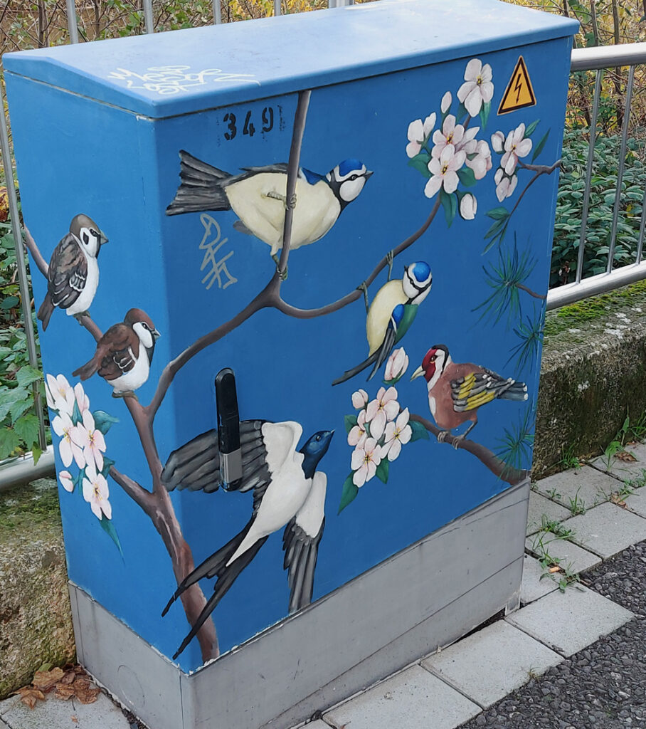 Am Promenadenweg an der Sieg sahen wir einen schön bemalten Trafokasten. Und an der Mauer gegenüber hatte ein Künstler eine Schar von Wasservögeln verewigt, sehr zu unserer Freude. Auf dem Rückweg zur Hauptstraße entdeckte Winfried diese kleine aber feine „Fahrrad-Reparatur-Werkstatt“