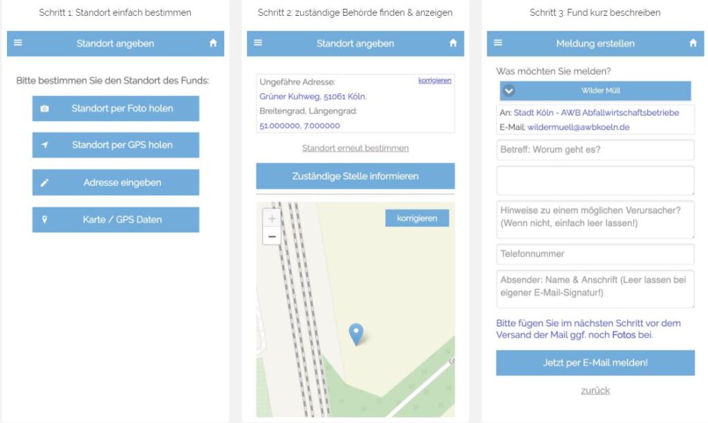 „Wilder Müll geht uns alle an! Denn wilder Müll verschandelt nicht nur unsere Umwelt, sondern stellt eine erhebliche Gefahr für Natur und unsere Gesundheit dar! Mit dem MÜLLweg! DE Mängelmelder melden Sie illegale Müllentsorgungen ohne Aufwand präzise und automatisch an die richtige Behörde, häufig das zuständige Ordnungsamt oder die Abfallwirtschaftsbetriebe. Diese kann die wilde Müllkippe schnell beseitigen – und vielleicht auch den Verursacher ermitteln und verfolgen.“