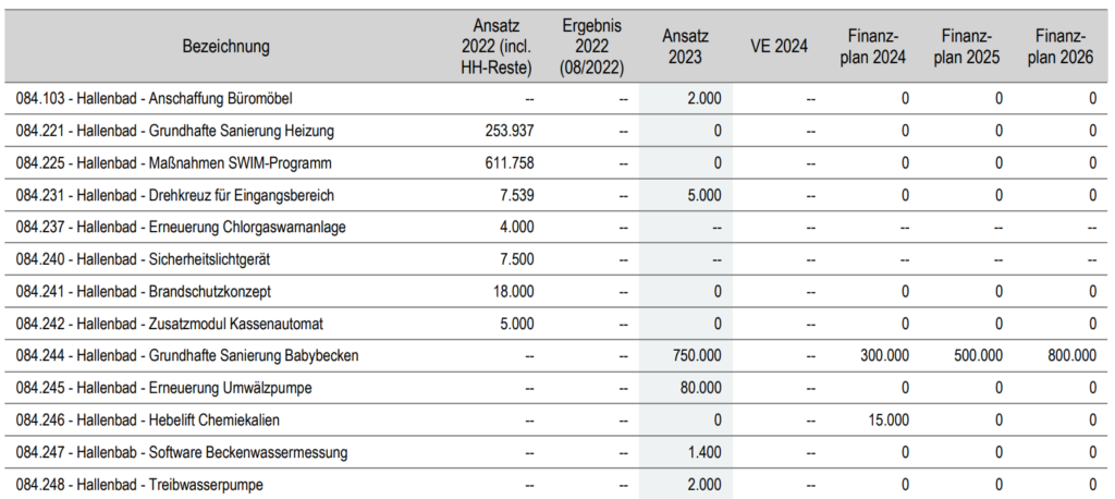 Die Tabelle zeigt, dass man die Sanierung des Babybeckens für die Jahre 2023 bis 2026 angesetzt hat mit Kosten in Höhe von 2,35 Millionen €. Das sind gewaltige Summen. Für den Preis kann ich in Hessen 4 schlüsselfertige Einfamilienhäuser (Fertighaus) inklusive Grundstück von 500m² Größe erwerben.