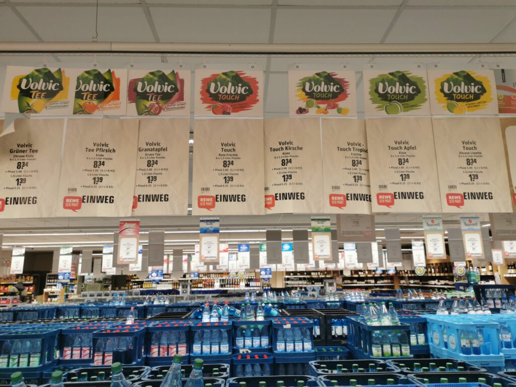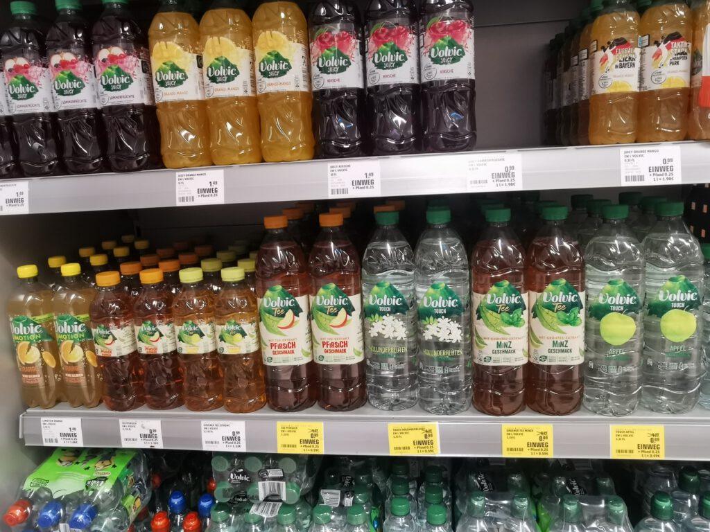 Uns Kunden ist egal, ob die Flasche im Regal steht oder in einer Kiste in der Volvic-Ecke. Schließlich ist ja der Inhalt der Gleiche. Und warum werden eigentlich die Flaschen zusätzlich zu den Kisten in Plastik-Packs verpackt. Da die Flaschen im Pfandautomaten eh zerdrückt werden und somit nicht zurück in die Kiste kommen, gehen doch sowieso leere Kisten an Volvic zurück. Dann könnten die Mitarbeiter auch die Kisten ausräumen und ins Regal stellen. Würde eine Menge Plastik sparen. Und um die ganze Angebotspalette ins Regal zu packen, müssten andere Getränke weichen oder das Regal vergrößert werden.