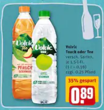 Dieses Angebot war im Rewe-Prospekt (27.12.-31.12.21) auf der letzten Seite abgebildet. Da wurde Volvic1 Tee oder Touch für 89 Cent beworben. Und das in verschiedenen Sorten.