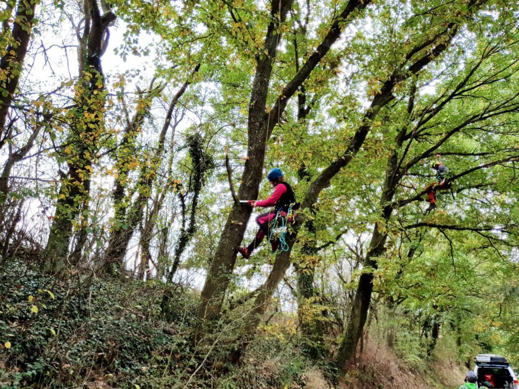 Mit einem kleinen Gewicht am Seil werden die Kletterseile in den Baum gebracht, so dass Kletterin