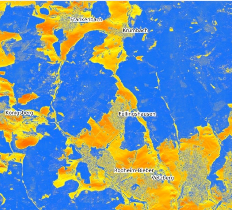 Die blauen Felder sind Waldgebiete, wo es gelb bis