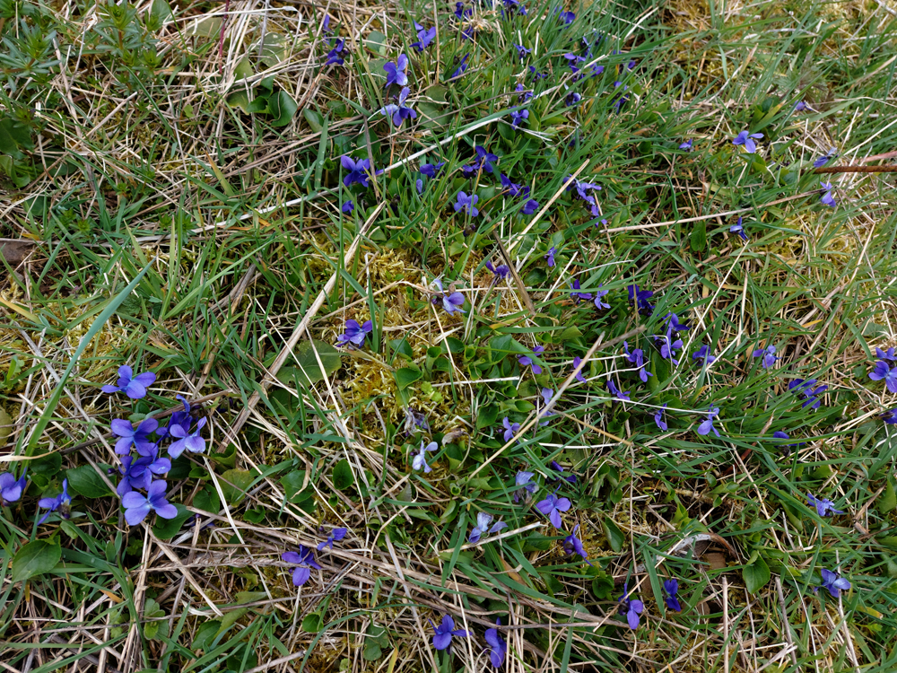 Die oben im Foto abgebildeten Veilchen wären in wärmeren Jahren längst verblüht. Aber am Fuße einiger Weißdorn- und Wildrosensträucher findet man sie und andere Frühblüher. sogar noch in Knospen.