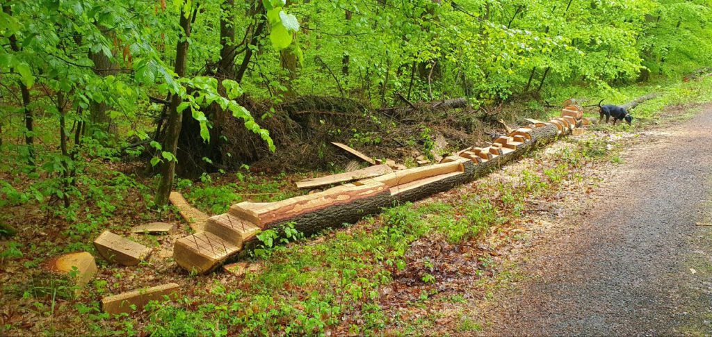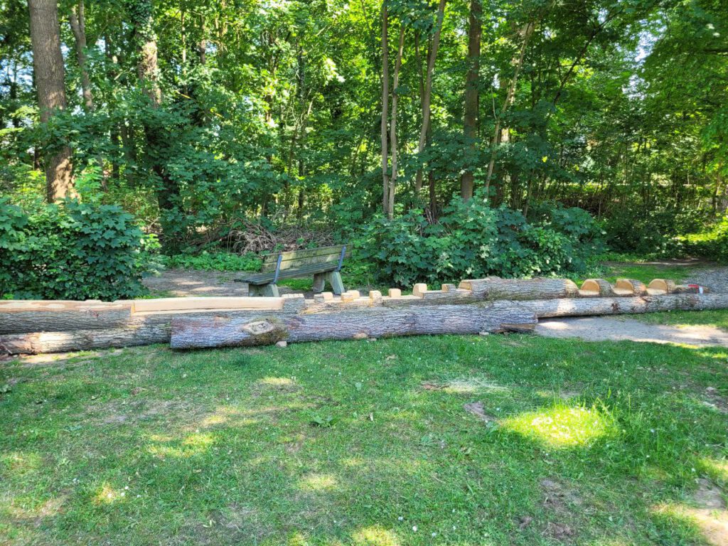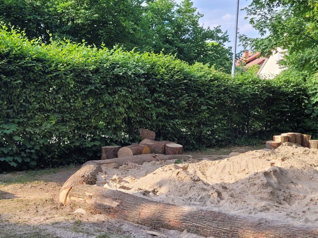 Neuer Sand ist schon mal da. Baumstämme zum Sitzen, nehme ich mal an…Super Weiter so! Wir / ich werde dann berichten, wenn der Spielplatz wieder NEU ist.