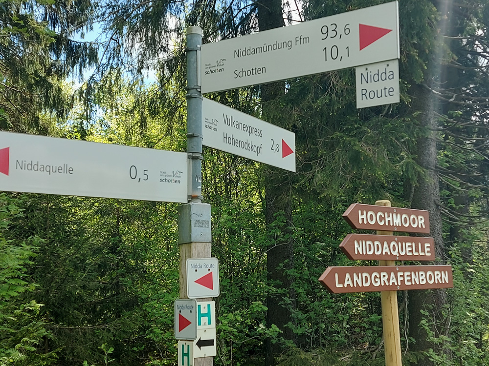 Eigentlich wollten wir am Himmelfahrtstag ins Rote Moor in der Rhön. Aber zweimal 2 Stunden Fahrt für einen Tagesausflug war uns zuviel. Also suchte ich Moor und Vogelsberg und wurde fündig. In der Breungesheimer Heide, die zu Schotten gehört, gibt es die Nidda-Quelle und das einzige Hochmoor*1) Hessens. Aber es war noch nicht viel zu sehen, es blühten noch einige Weiden, der Löwenzahn leuchtete gelb. Auf über 700m Höhe war der Frühling noch nicht lange eingezogen. Doch es gab einen wunderbar weichen Waldweg und schöne Baumgestalten. Ende Mai-Anfang Juni wird hier mehr an Blütenpracht zu sehen sein. – Auf dem Hoherodskopf war riesiger Betrieb. Dort kehrten wir nur für eine Teepause ein und machten uns bald davon.