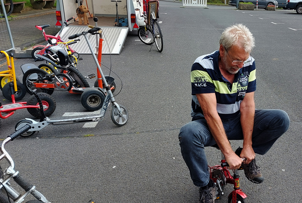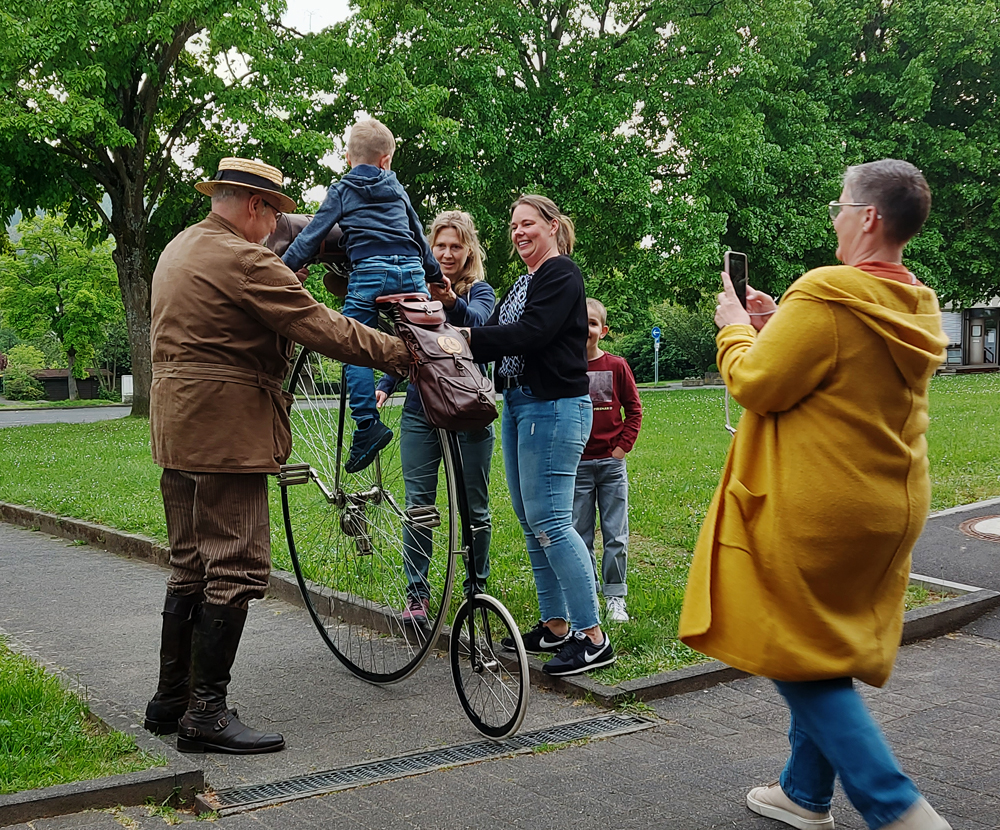 Dies hier ist echt Biebertal: Auf dem Hochrad von Herrn Leuer aus Rodheim, abends vor La Vinia. Das Hochrad wurde 1871 in England erfunden und hatte Gummireifen.