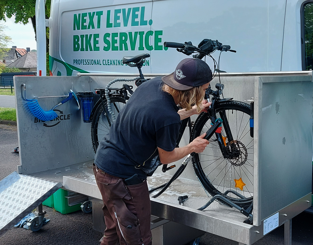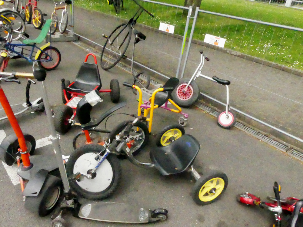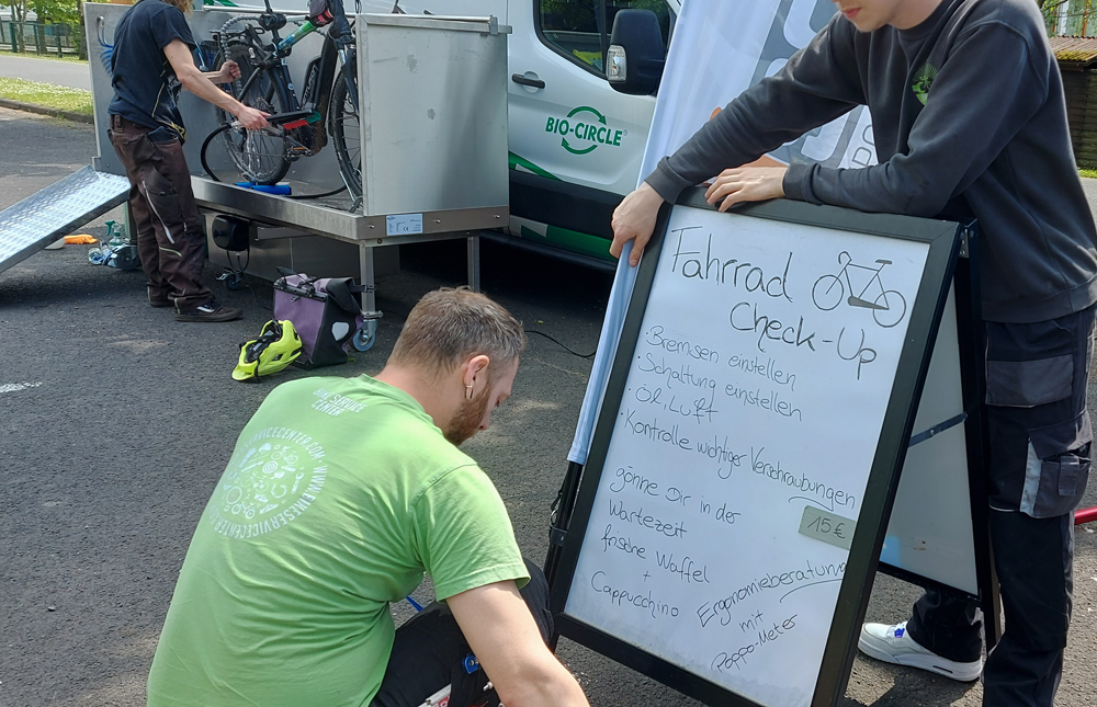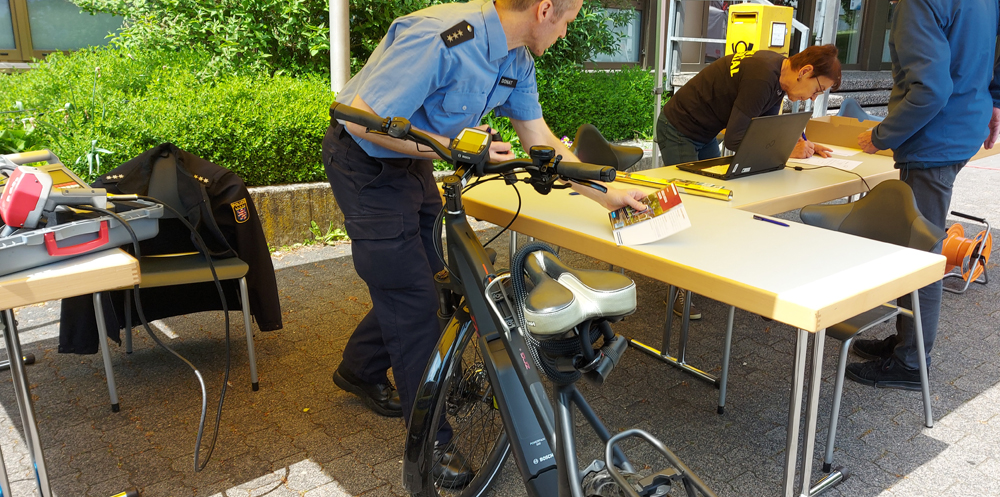 Es war ganz ruhig auf dem Rathausplatz, als wir am 20. Mai gegen 14.00 zum Rathausplatz kamen. Auffällig war eine lange Schlange von Leuten mit Rädern, die geduldig darauf warteten, dass ihr Fahrrad codiert würde. Sonst muss man sich extra dafür anmelden und nach Gießen fahren. Eine kleine Schlange gab es auch vor der Fahrradwaschanlage.
