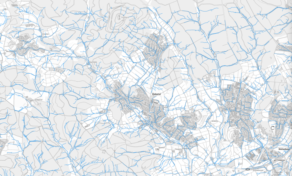 und darunter die Fließkarte unserer Biebertaler Bäche, die bei Starkregen anschwellen können und werden.