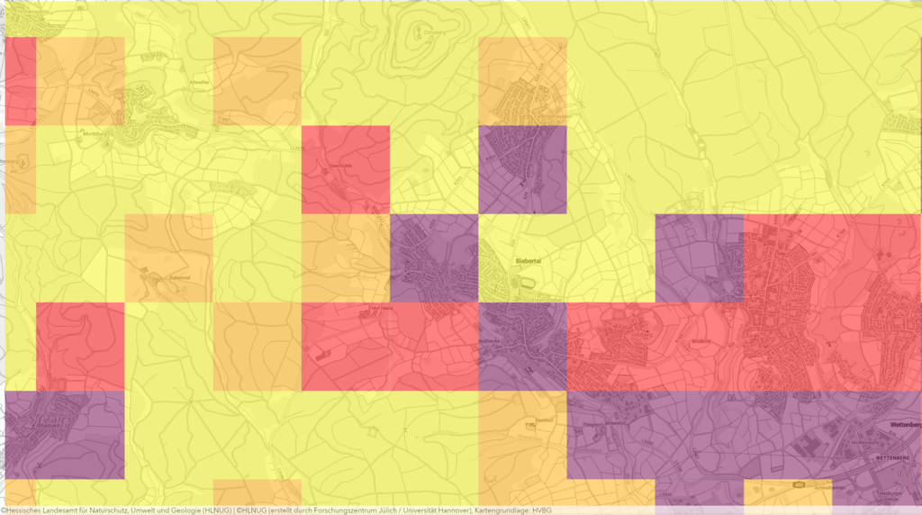 Nebenstehend die Wahrscheinlichkeiten für Starkregenereignisse in Hessen.