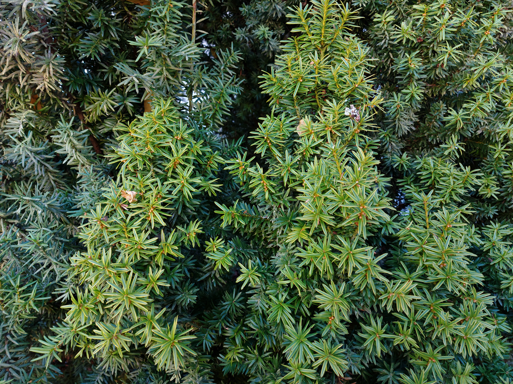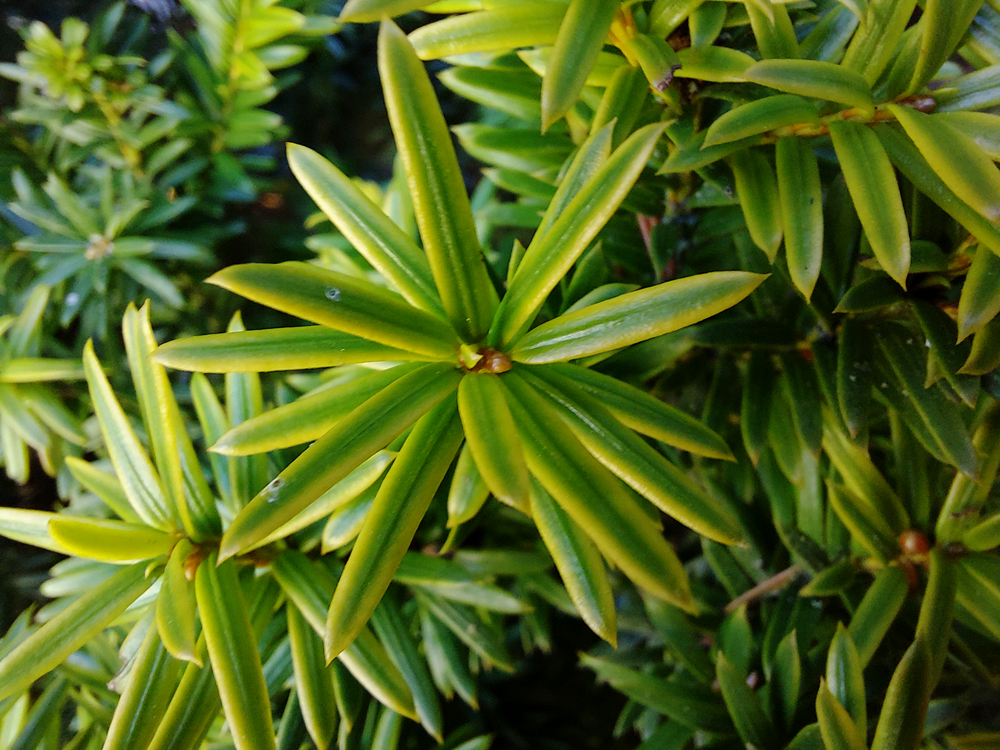 Bei den Eiben links handelt es sich um Sämlinge, die in ca. 15 Jahren noch nie beschnitten wurden. Nur einzelne Zweige wurden floristisch verwendet. Oben der buntlaubige Sämling aus der Nähe