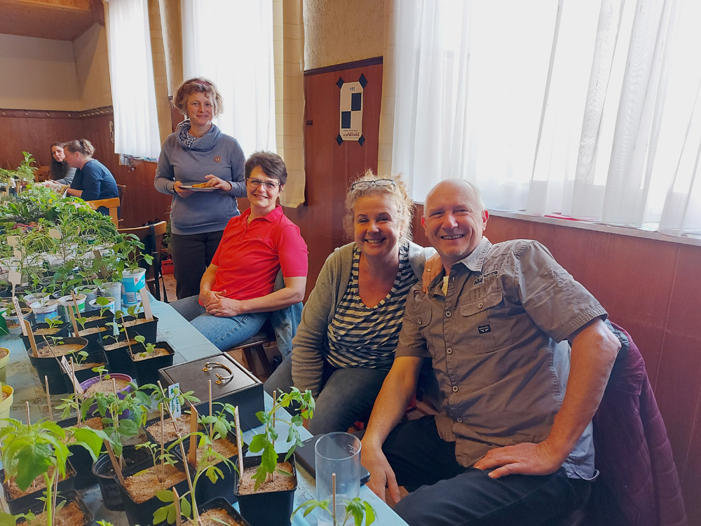 Die erste Gartenbörse in Treis, organisiert von Christine Reimer (im gestreiften T-Shirt), führte auch zur Bekanntschaft mit einigen Aktiven der “Gartenliebe Lumdatal”. Das ist ein Zusammenschluss von derzeit 8 Menschen mit dem Ziel von Gemeinschaft und gegenseitiger Hilfe. Aber auch Entspannung vom Bürojob spielt eine Rolle. Liebe zur Natur vereint alle. Die eigenen Gärten fehlen oder sind zu klein. Man hatte schon mal einen gemeinsamen Acker; momentan wartet man auf den nächsten,der wenigstens 500m² groß sein sollte. Das ist gar nicht leicht, es sind auch etliche Auflagen daran geknüpft. Aber die Gruppe sieht ein Umdenken in der Gesellschaft, viele junge Leute möchten einen Kleingarten haben. Tara ist mit 15 die jüngste, Lilly Grabo mit 82 die älteste.