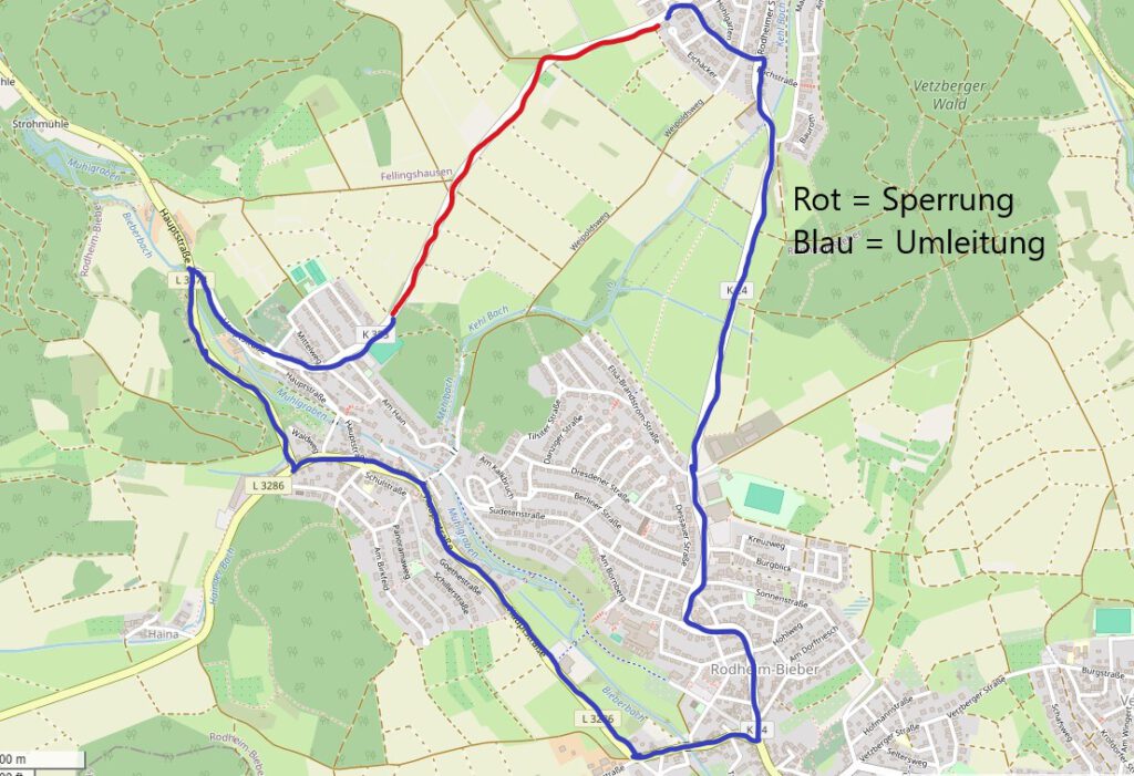 Auf jeden Fall wird der Verkehr diese Woche über die K24, die L3286 und die L3474 umgeleitet. Anlieger können bis Baustelle fahren.