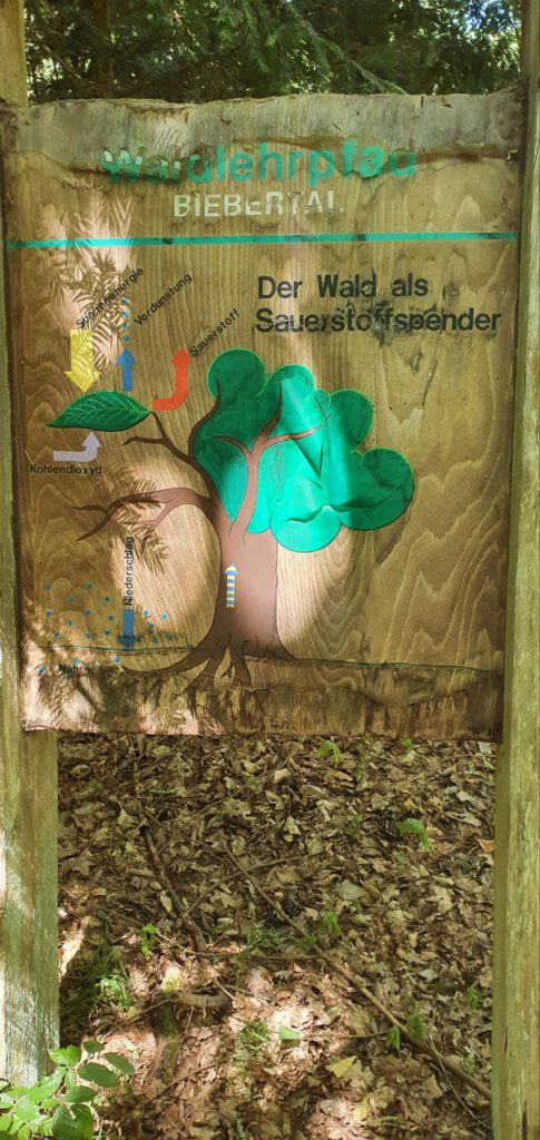 Am prall in der Sonne liegenden Waldsportplatz oberhalb von Rodheim gestartet, entdeckten wir bergan wandernd die nebenstehende Schautafel – ein Rest des ehemals bestehenden Waldlehrpfades, an dem vor Jahren auch die Baumarten im Biebertaler Wald ausgeschildert waren.