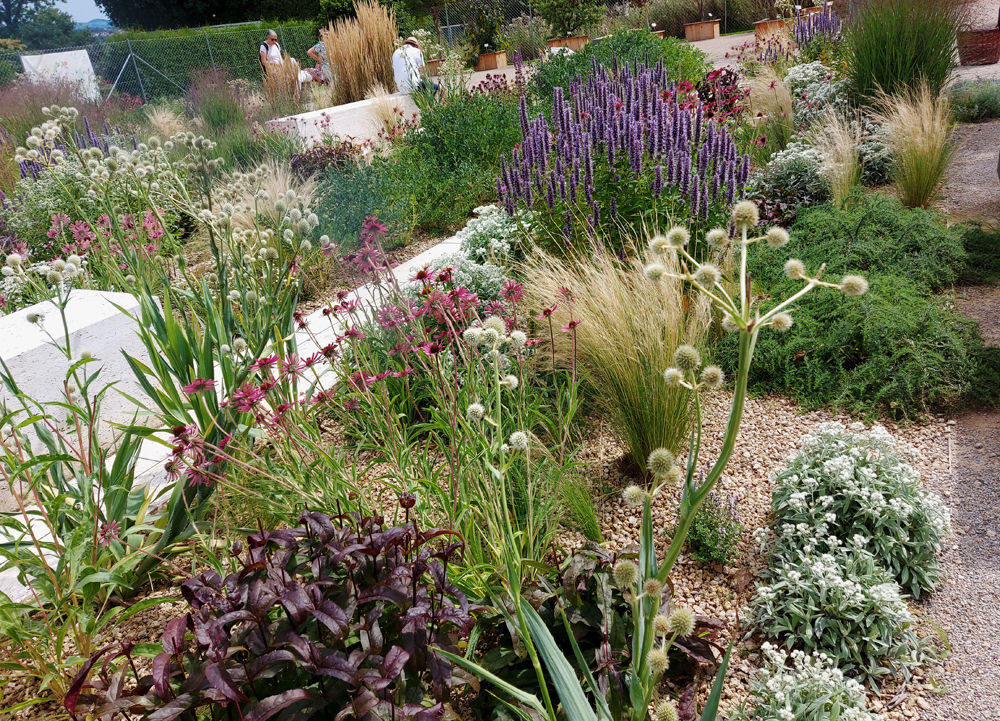 Die Bepflanzung ist farbig und zieht viele Insekten an. Auch im Winter sind die trockenen Blütenstände schön. Im Frühling fühlen sich hier einfache und Wild-Tulpen wohl.