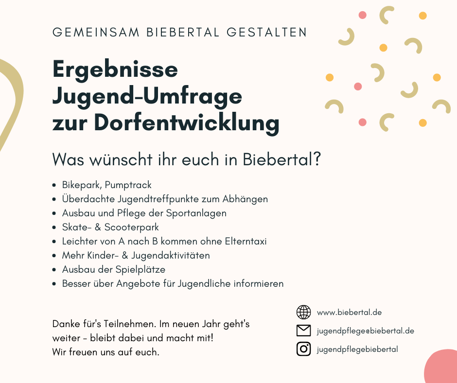 ja das ist immer eine interessante Frage. In der Regel sitzen in den Vertretungen häufig doch Erwachsene und diese sind auch schon einige Tage raus aus der Jugendzeit. Aber was bewegt die Jugend von heute, die ja die Bürger von morgen sind? Um diese bei der Dorfentwicklung nicht durchs Raster fallen zu lassen, haben die Verantwortlichen unsere Biebertaler Jugend befragt.