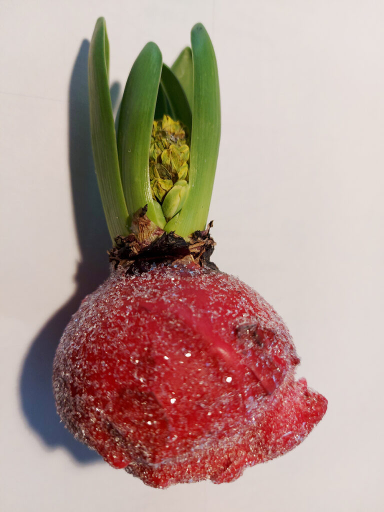 Offenbar werden inzwischen auch andere Blumenzwiebeln so vermarktet, wie man an der Hyazinthenzwiebel sieht, die ich kürzlich geschenkt bekam. Das ist ein riesiger Unsinn und Missachtung des Lebewesens Pflanze. Aber es gab ja auch mal eine Zeit, in der Frauen in der katholischen Kirche nicht als Menschen galten und Afrikaner wie wilde Tiere im Zoo ausgestellt wurden (letzteres ist gerade mal ein Jahrhundert her). Die genannten Blumenzwiebeln legen zwar die Blüten schon vor ihrer Ruhephase an, aber damit sie sie später schön ausbilden können, brauchen sie Luft und müssen Wasser einlagern. Wie Sie aber selbst sehen, hat die Hyazinthe gar keine Wurzeln, mit denen sie trinken kann.