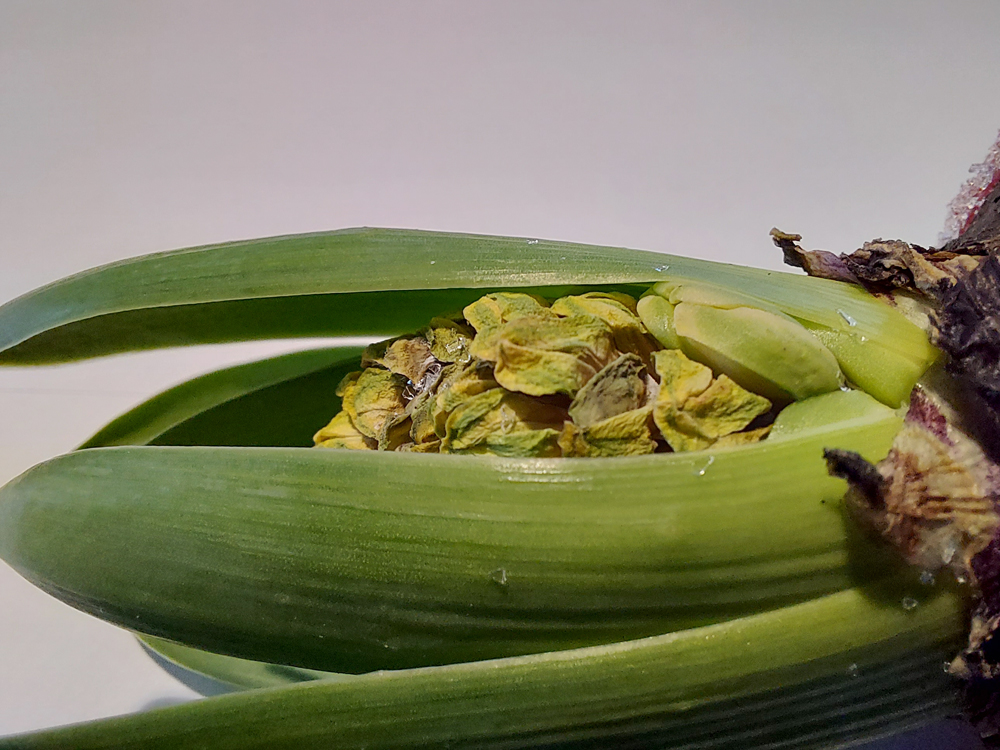 Die Knospen der Hyazinthe sind rechts noch frisch, links eingetrocknet