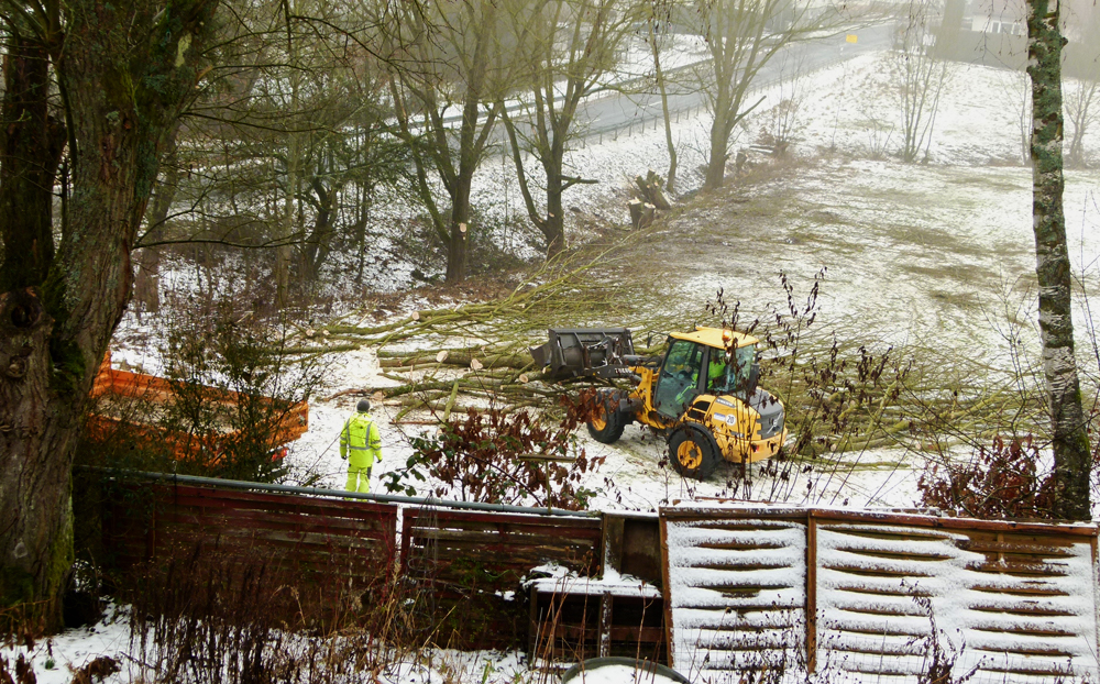 Von den Mitarbeitern des Bauhofes wurden nicht alle Bäume gefällt, sondern immer welche zwischendurch „auf den Stock gesetzt“. Was bedeutet das? Die Weiden sind schnellwüchsig, Die verbliebenen Stämme werden bis zum Herbst schon wieder einen Zuwachs zwischen 1 und 2m haben. Da der Stamm an ganz vielen ruhenden Knospen austreiben wird, ist der Lärmschutz im Herbst besser als bei Einzelstämmen.