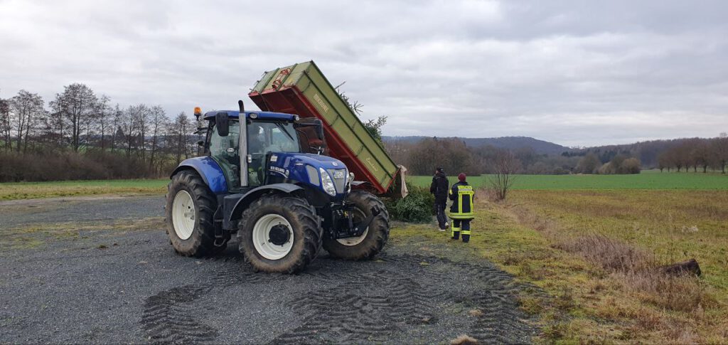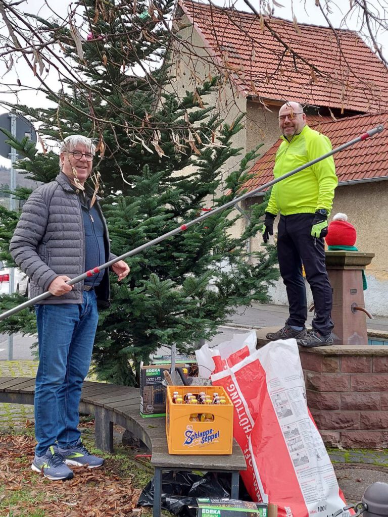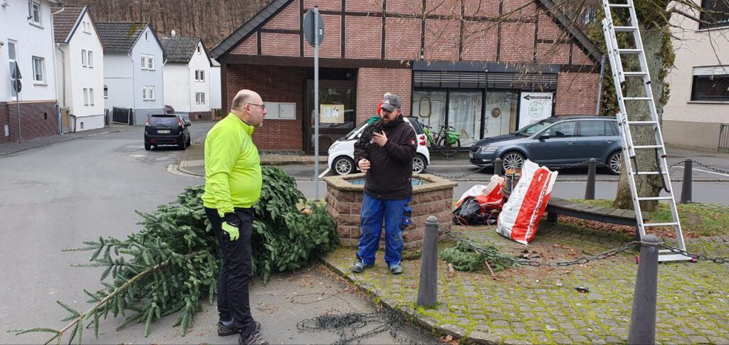 Alle ausgedienten Weihnachtsbäume mussten komplett abgeschmückt sein und bis um 8 Uhr morgens am Rand des Bürgersteiges bereit liegen. Das galt auch für die für die Allgemeinheit in den Dörfern aufgestellten Bäume, wie der hier am Dorfbrunnen in Fellingshausen.