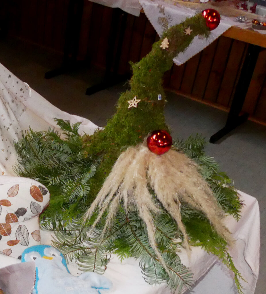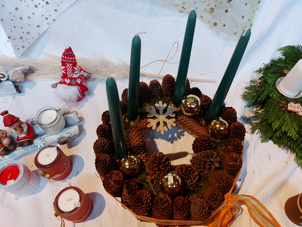 Ein Adventskranz aus Fichtenzapfen, den man immer wieder verwenden kann. Links davon steht eine Kerzenbank. Dafür werden ein paar lackierte dicke Aststücke gebraucht, miteinander verschraubt, Kerzen drauf und etwas Dekoration – fertig. Und der Kranz rechts zeigt: Es muss nicht immer Tanne sein, aber immergrüne Zweige sollten es für Weihnachten schon sein – wenn man auf den Ursprung des Weihnachtsfestes bzw. der Wintersonnenwende zurückkommen will. Die Frauen vom Kultur- und Heimatverein haben aus einer großen Fülle von Möglichkeiten geschöpft und einen schönen Basar organisiert.