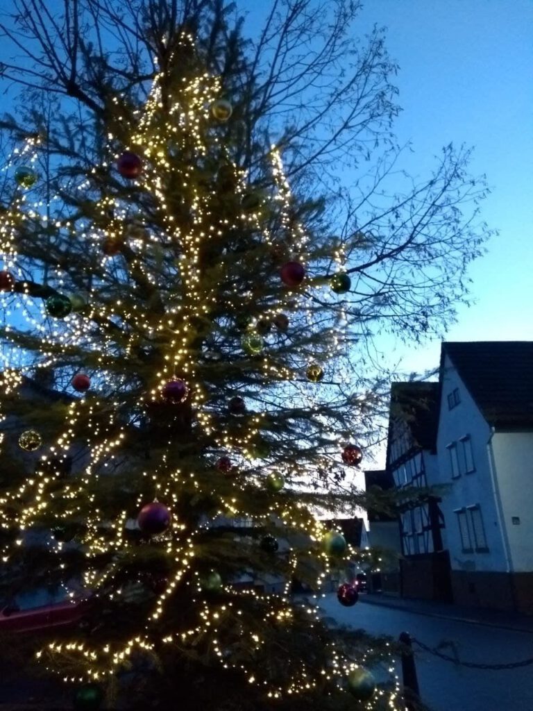 Es seien eines Tages umsichtige Männer gekommen und hätten genau dieses Bäumchen zum Weihnachtsbaum auserkoren und die Frauen aus dem Ort hätten dann etwas ganz besonderes aus diesem viel zu langen, schiefen aufgestellten, in eine Linde gequetschten und mit dürren Ästen ausgestatteten Baum gemacht.
